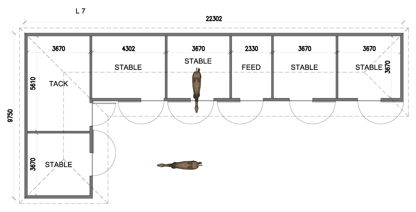 This stable would be more ideally suited in a larger space with space required for the structure being 22302mm x 9750mm.